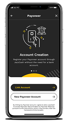 فری لانسرز اب اپنے نئے Payoneer اکاؤنٹ کو JazzCash موبائل اکاؤنٹ ایپلیکیشن کے ذریعے رجسٹر کر سکتے ہیں یا اپنے موجودہ Payoneer اکاؤنٹ کو JazzCash کے ساتھ لنک کر سکتے ہیں۔ اکاؤنٹ کھولنے کے لیے بینک جانے اور وسیع دستاویزات فراہم کرنے کی ضرورت نہیں ہے۔